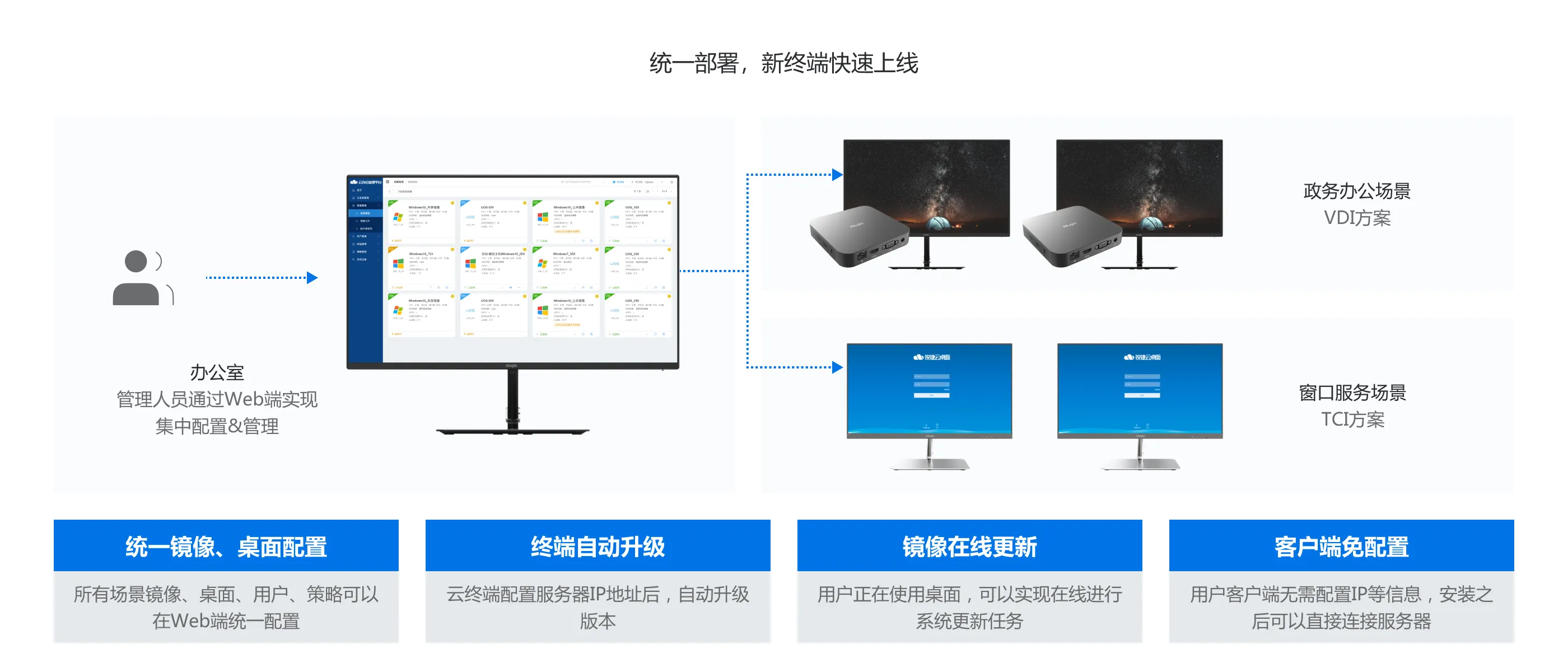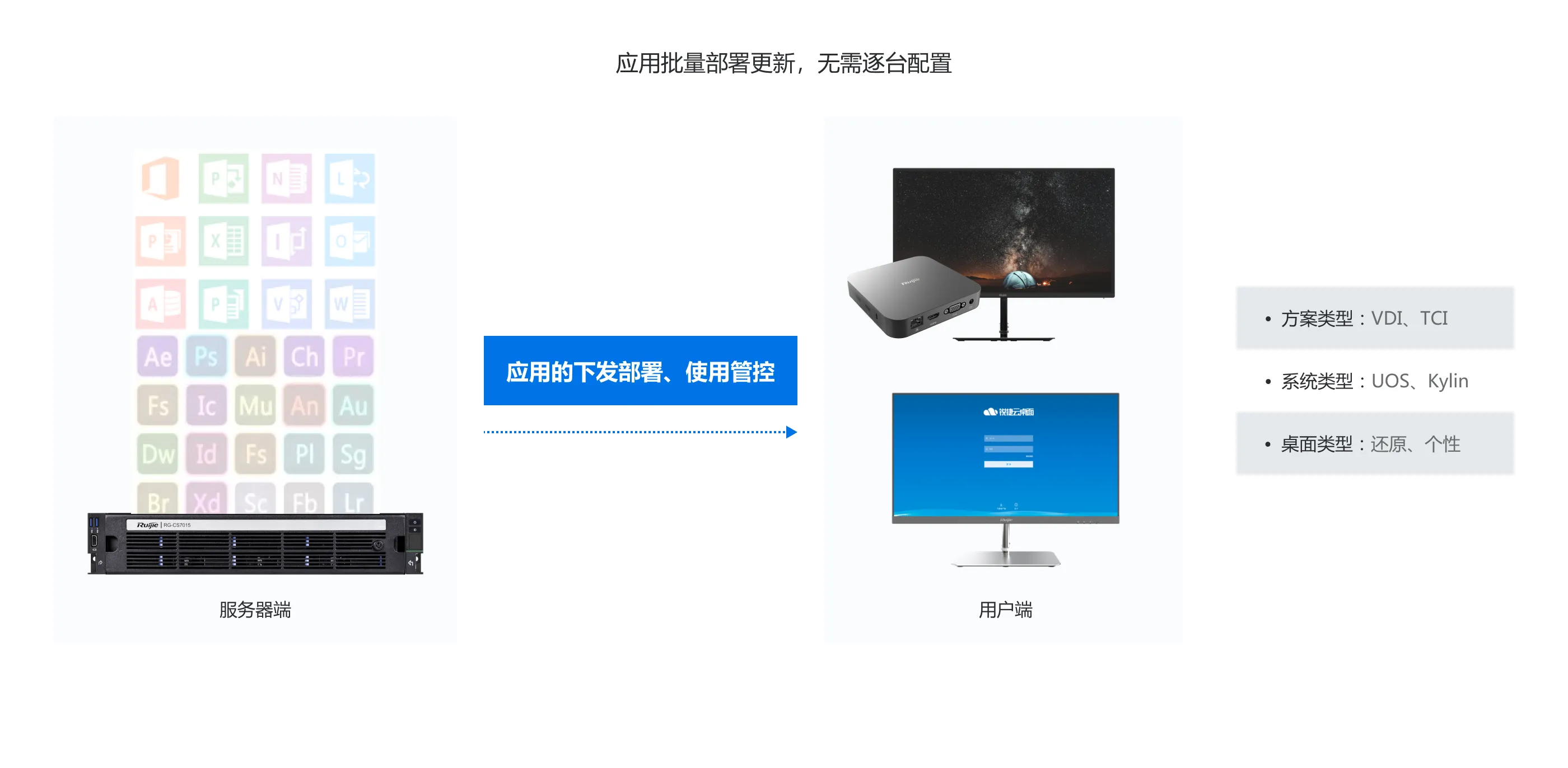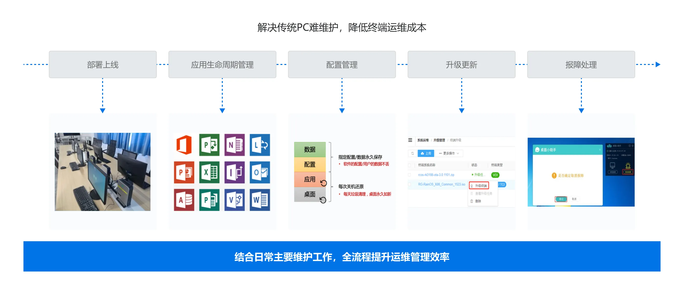 PC模式管理效率低,运维人员跑断腿,故障恢复的时效性严重影响到办公业务的正常开展,需要一套高效、全面的工具来提升客户的桌面办公效率。